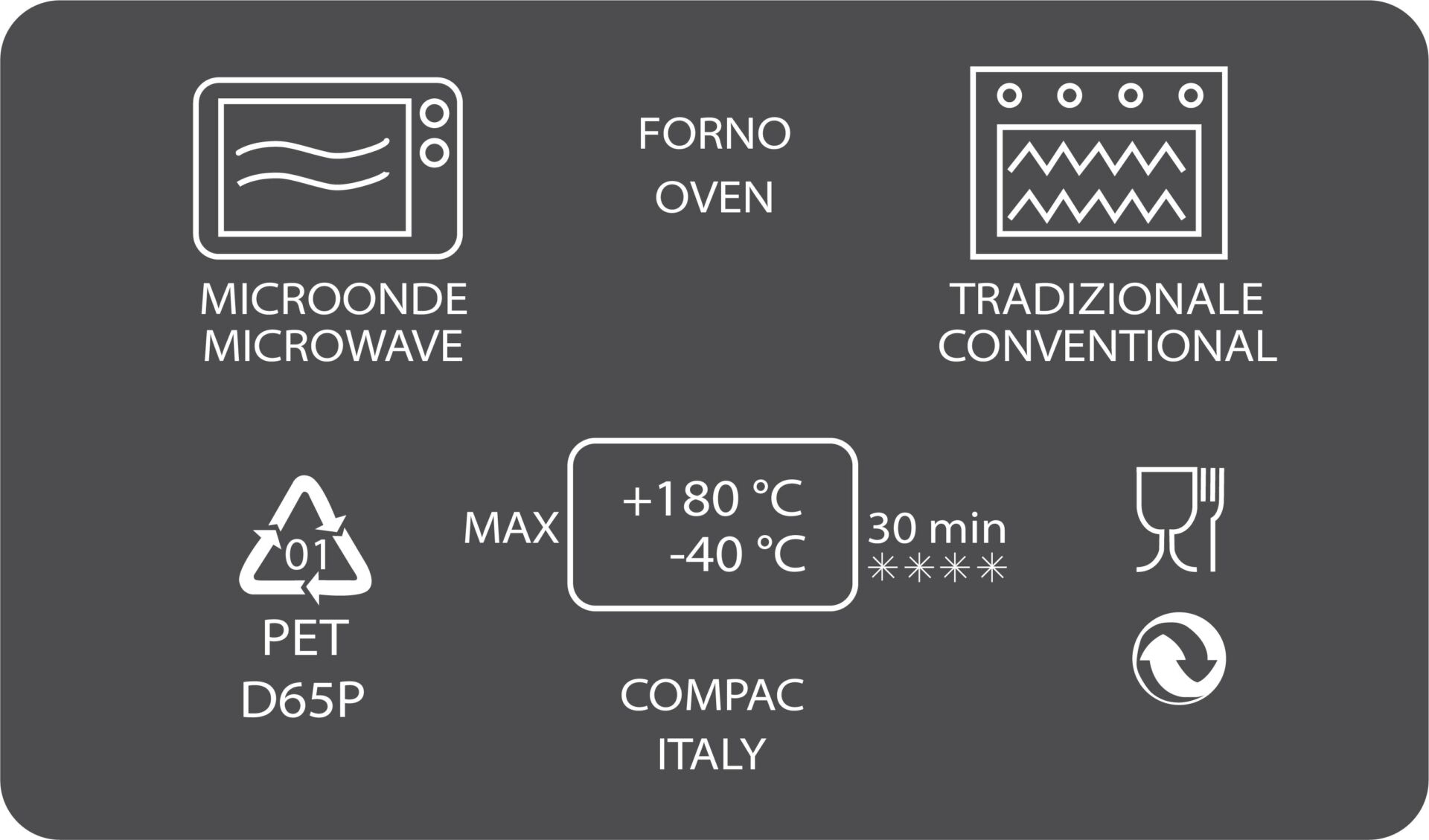 In Traditional oven up to +180°C for 30 minutes and in Microwave up to 800W for 5 minutes | Use for cooking only after the sealing of the package with a READY TO COOK food | In the FRIDGE | Down to -40°C |