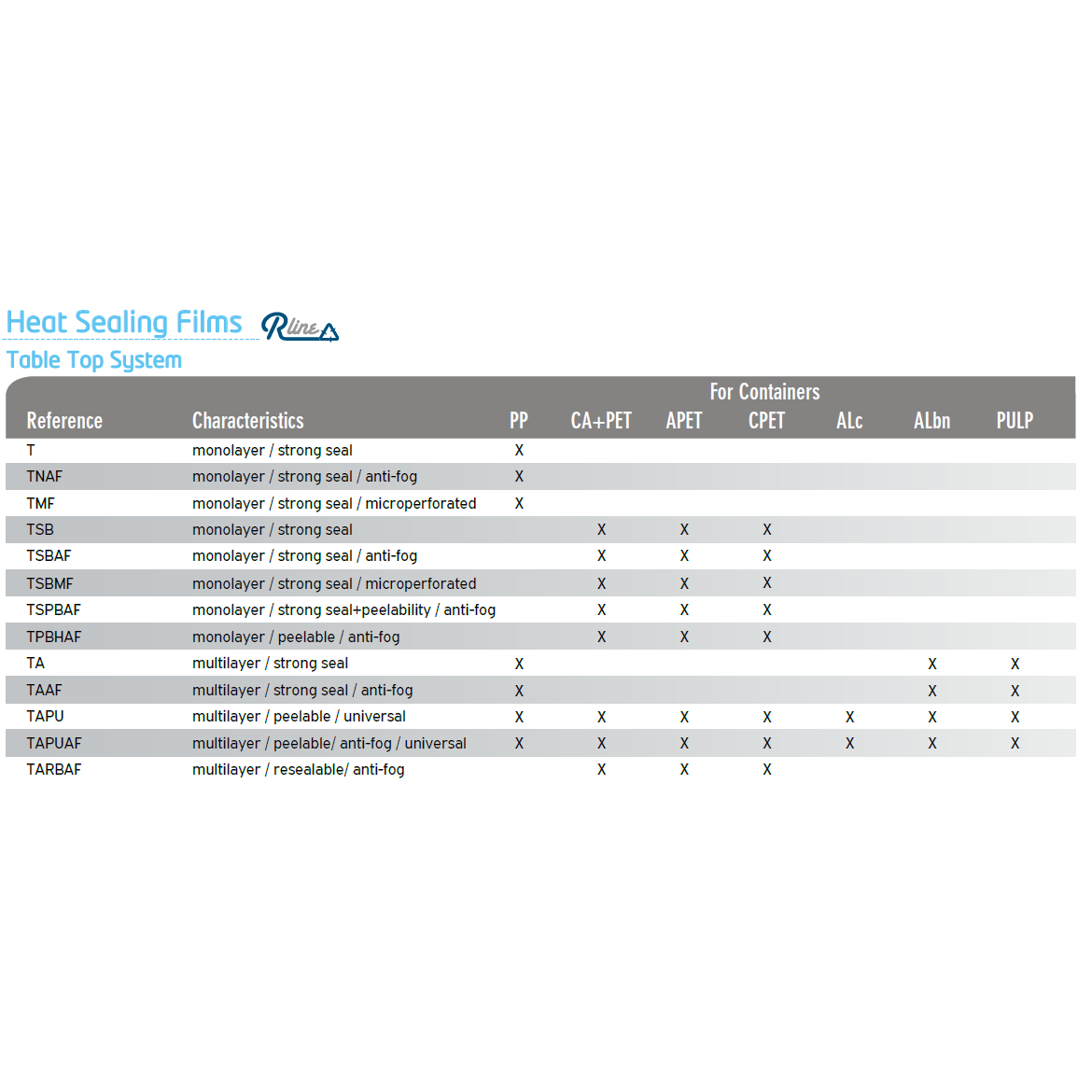* TOPAU – multilayer / peelable / seals Containers and Trays in Polypropylene – PP, Containers in Cardboard + PP – CA + PP, Containers and Trays in Cardboard + PET – CA + PET, Containers and Trays in Polyethylene Terephthalate – APET, Containers and Trays in Crystallized Polyethylene Terephthalate – CPET, Containers and Trays in Aluminium Smooth Wall – ALc, and Containers and Trays in Aluminium Smooth Wall – ALbn. It can be used in freezer up to -40 °C;