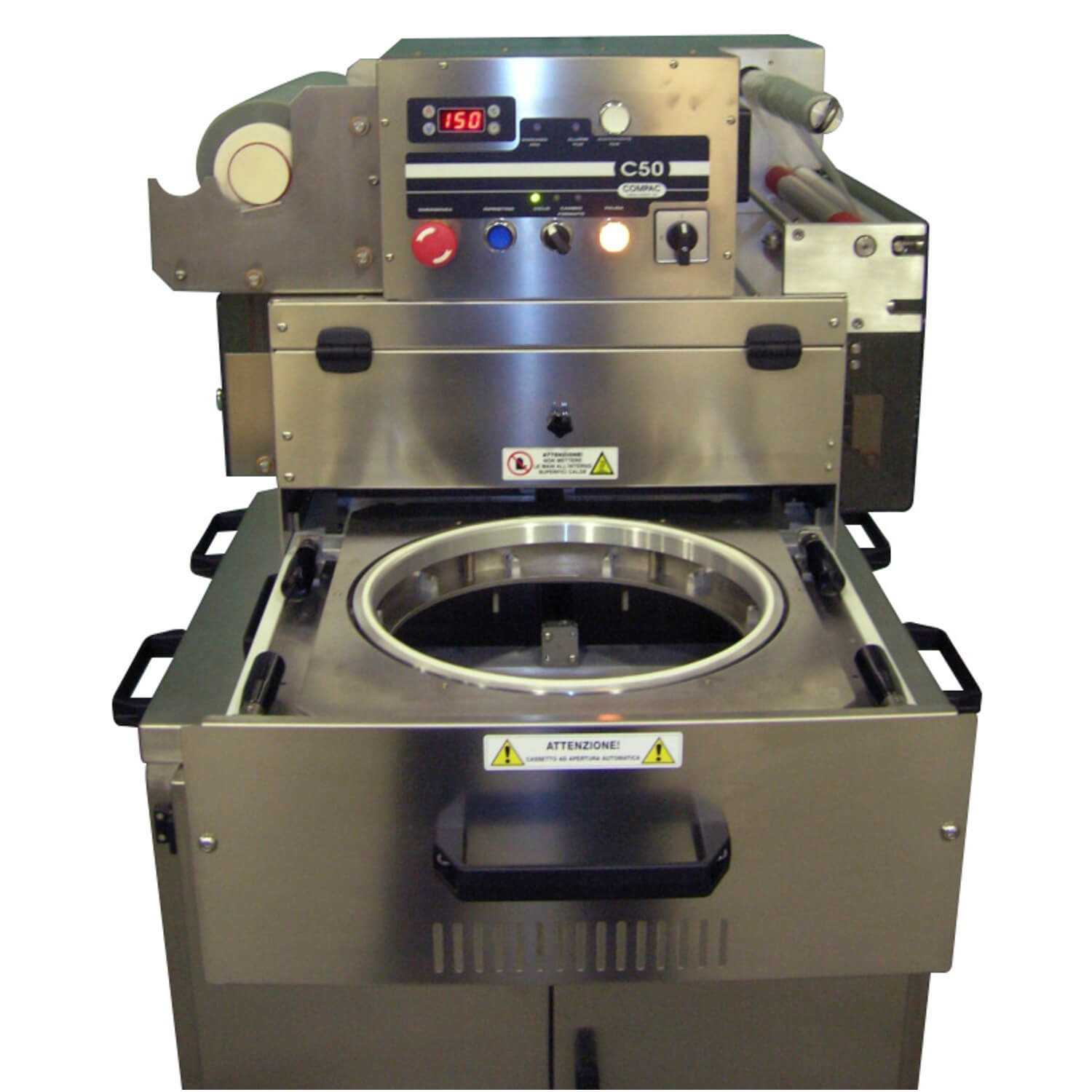 Scegliere il film di chiusura più adatto all’utilizzo del prodotto e spingere il cassetto all’interno della macchina, che provvederà in circa 4 secondi alla chiusura del piatto ed all’espulsione in automatico del cassetto. Applicata l’etichetta che riporta le informazioni necessarie, e la pizza sarà pronta per essere distribuita.